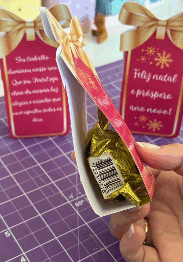 Com laço dourado, fundo vermelho clássico e espaço interno para colocar um bombom, ela une beleza, carinho e praticidade.