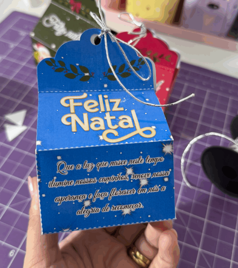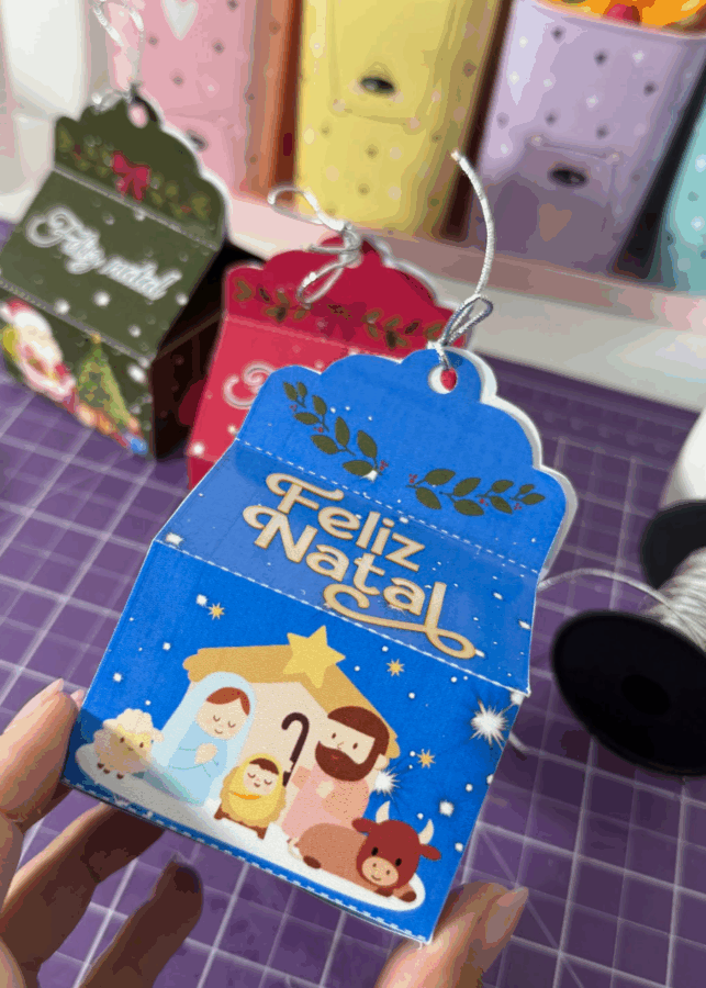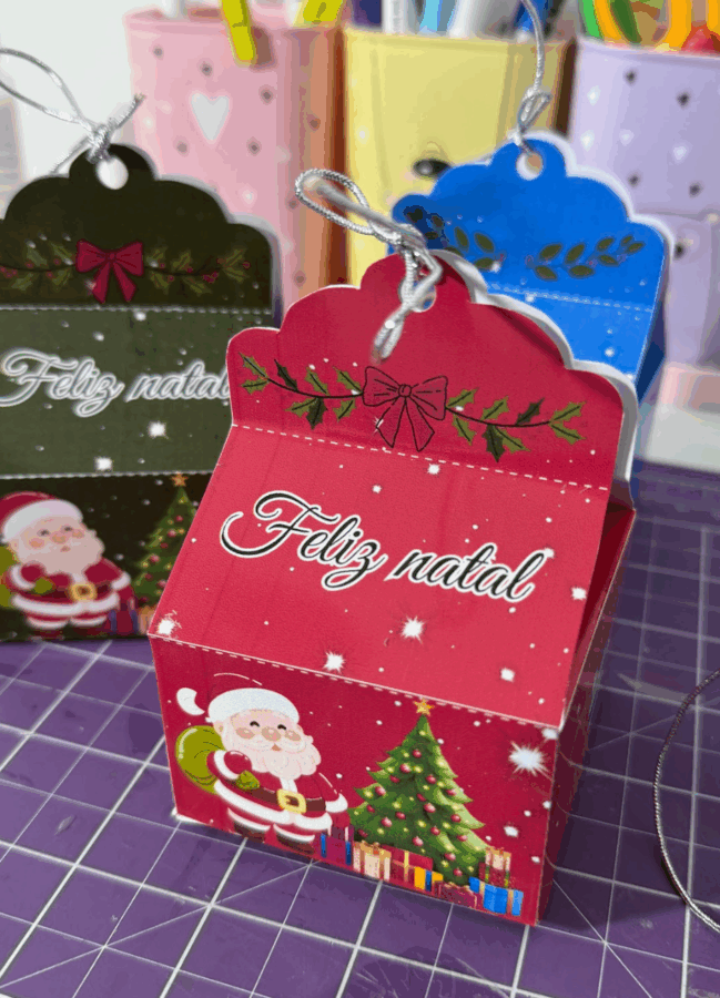 Você pode escolher entre diferentes cores e estampas natalinas para combinar com o estilo da sua escola ou da sua turma. Basta imprimir, recortar e montar — fácil, prática e muito charmosa! 🎁