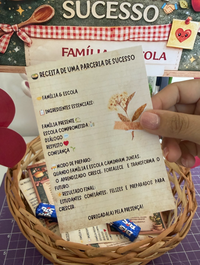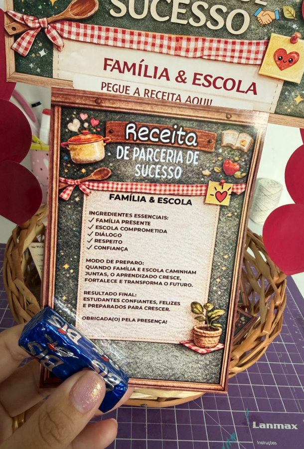 A Receita de uma Parceria de Sucesso é uma lembrancinha criativa e afetiva que simboliza a união entre família e escola, reforçando a importância do diálogo, do respeito e do compromisso com a aprendizagem.