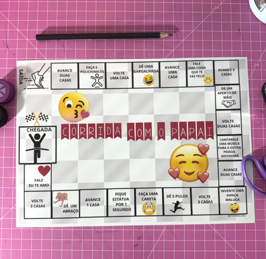 O tabuleiro apresenta uma trilha cheia de desafios leves, carinhosos e engraçados como:
