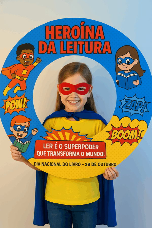 Ideal para sessões de fotos escolares, feiras literárias, projetos de leitura e cantinhos da biblioteca.