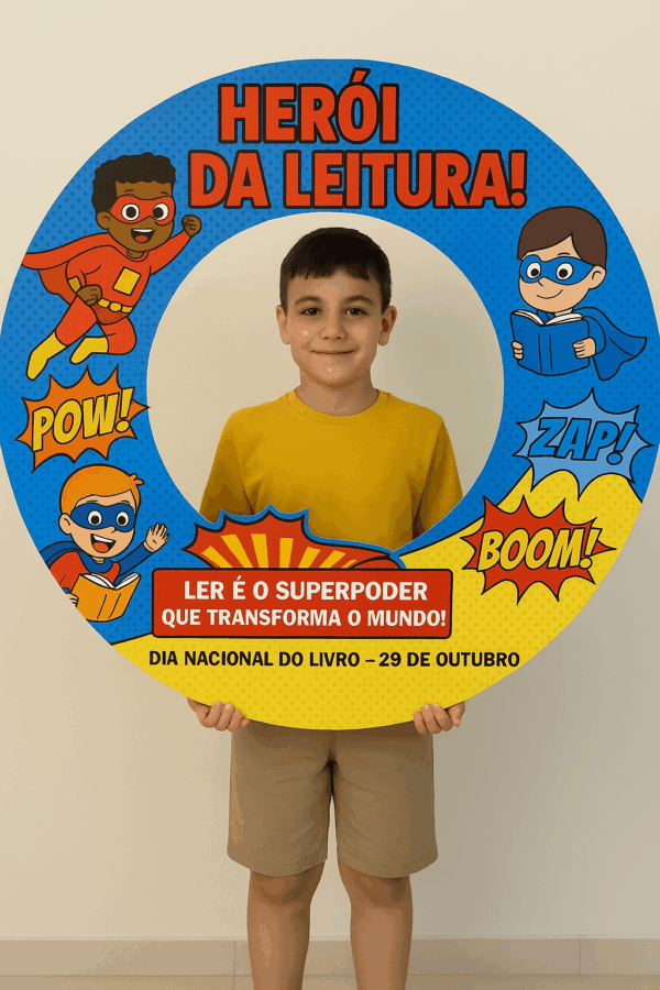 Frase principal: “Ler é o superpoder que transforma o mundo!” Vai opcão escrito heroí e heroína, você escolhe qual usar.