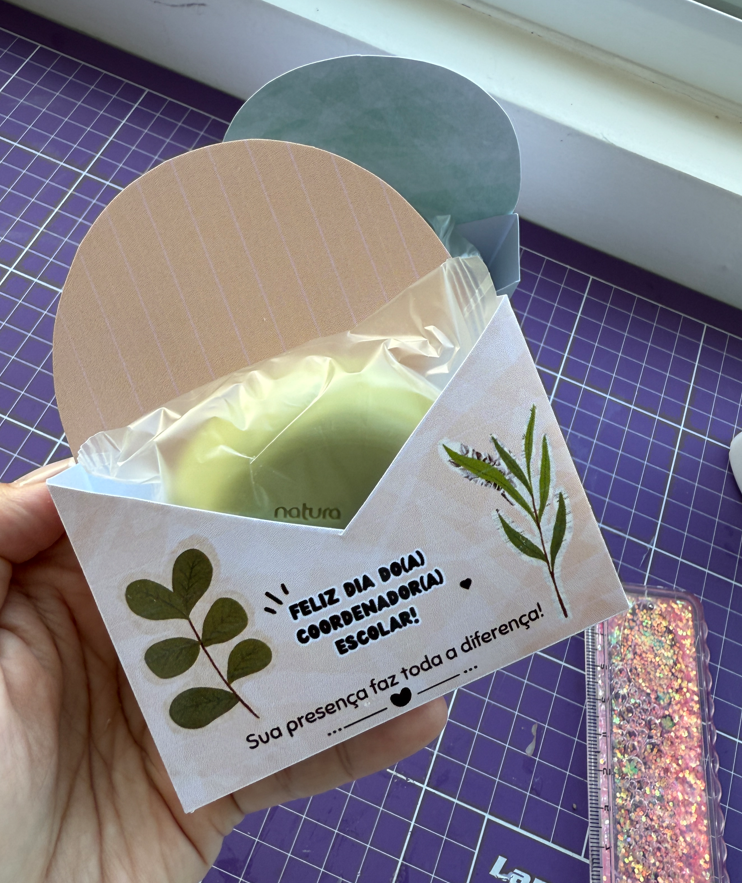 ✔ Porta-sabonete temático com duas opções de frases cheias de gratidão.