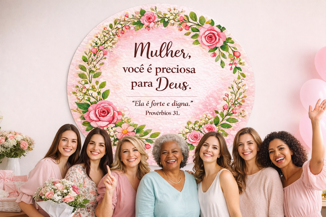 Painel decorativo em formato redondo, com mensagem inspiradora e delicada coroa de flores. Ideal para escolas, igrejas, empresas ou eventos comemorativos do Dia da Mulher.