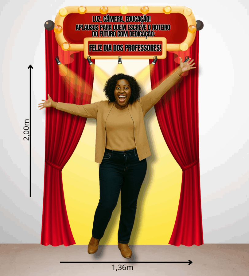 Com formato de palco e cortinas vermelhas, esse painel é perfeito para fotos e para destacar a importância de quem escreve o roteiro do futuro com dedicação.