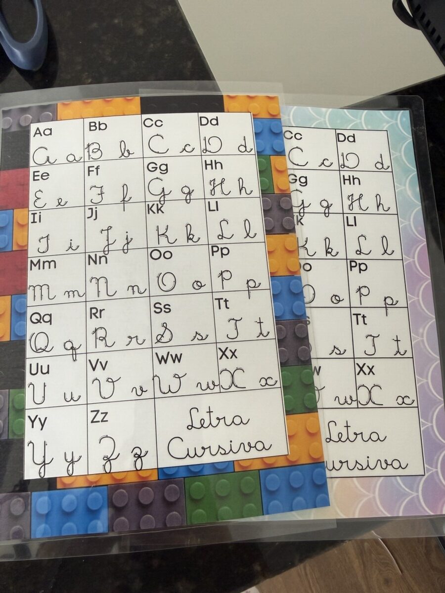 Tabela de consulta com alfabeto completo em letra cursiva, ideal para apoiar o processo de alfabetização e servir como referência diária para os alunos.